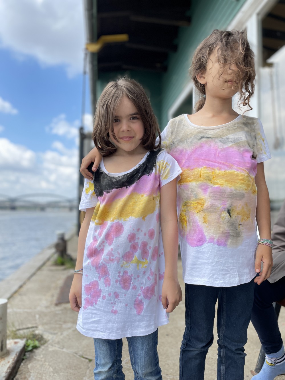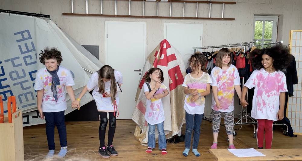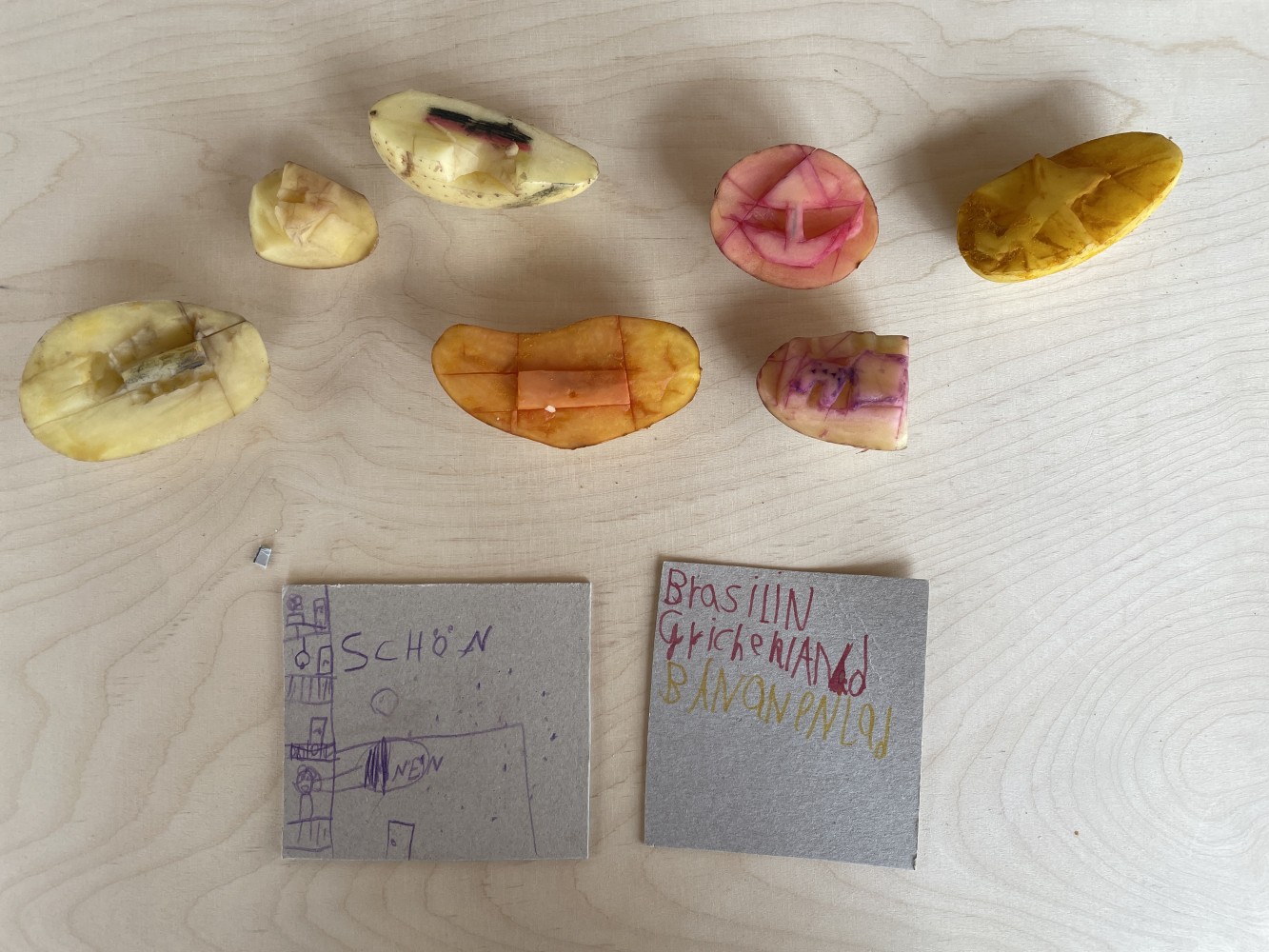 Unsere Wortspielereien, die sich aus den Antwortkarten ergaben wie z.B. "deutsche Segelhund-Bananen" oder "italienisch malen" druckten wir mittels Kartoffeldruck auf unsere T-Shirts, um zu zeigen wie banal Nationalitäten benutzt werden und beliebig ausgetauscht werden können. Am Ende performten wir mit unseren selbst bedruckten T-Shirts sogar eine kleine Tanz-und Gesangsshow!